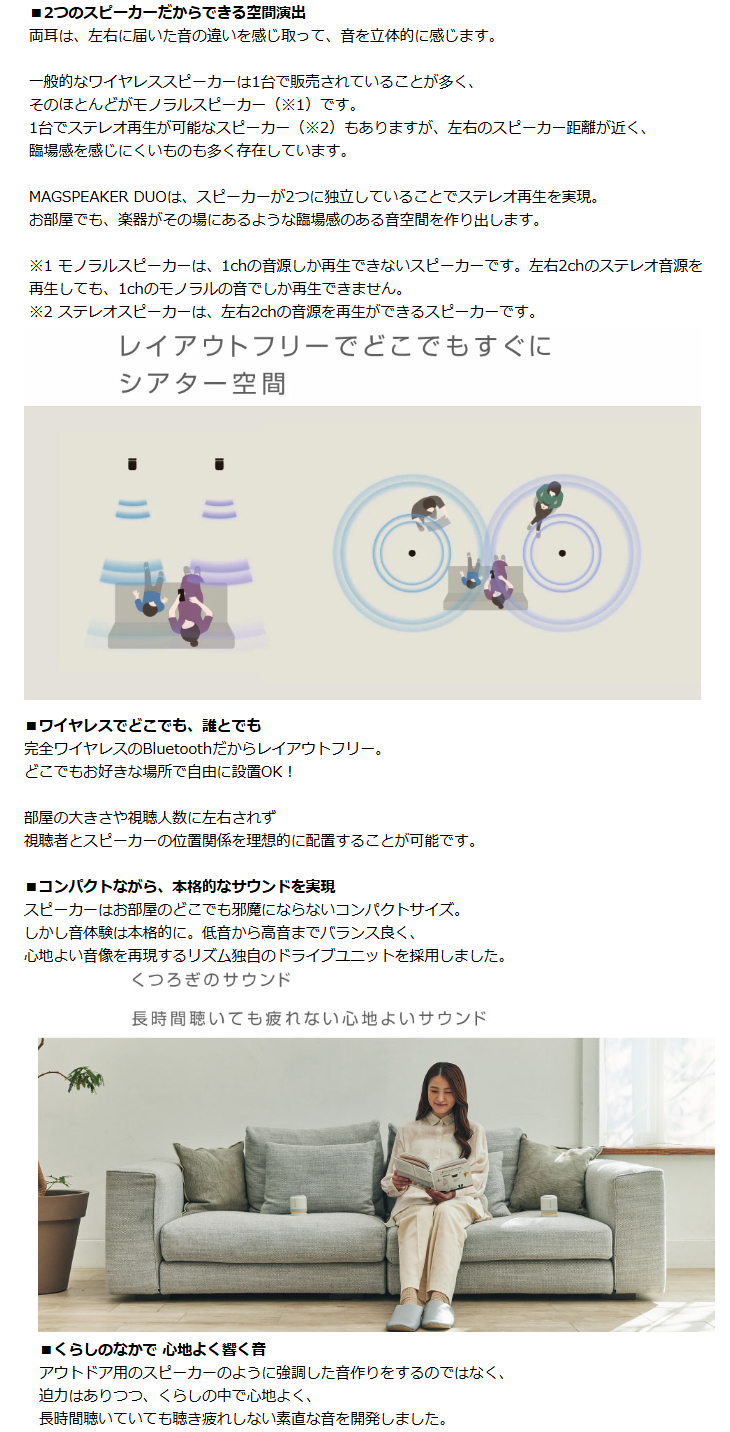 | 同梱 | スピーカー2個/充電スタンド1個/USBケーブルTYPE-C-A/取扱説明書・保証書 |