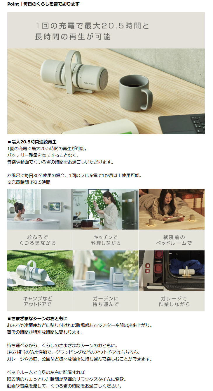 | 防水・防塵性能 | 本体…IP67相当 充電スタンド…IPX5相当 |