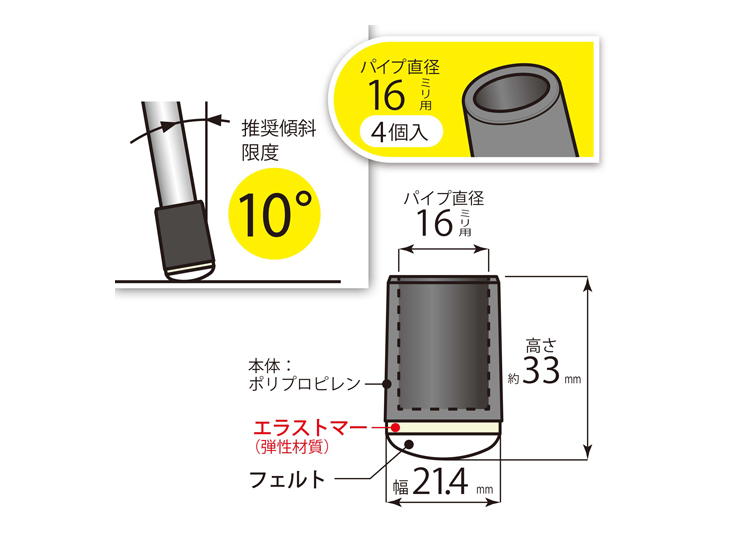| パイプ脚用キャップ 静音 適用パイプ直径16mm 21.4×33mm 4個入 FPK-201-16 スペック情報 |