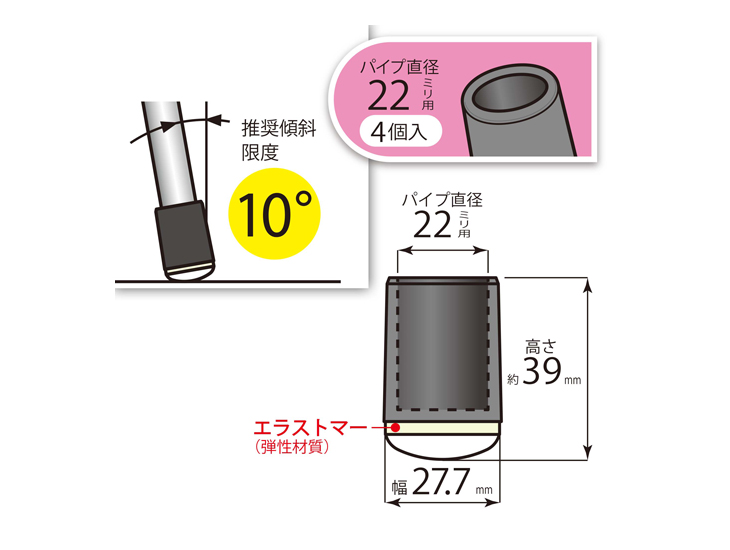 | パイプ脚用キャップ 静音 適用パイプ直径22mm 27.7×39mm 4個入 FPK-203-22 スペック情報 |