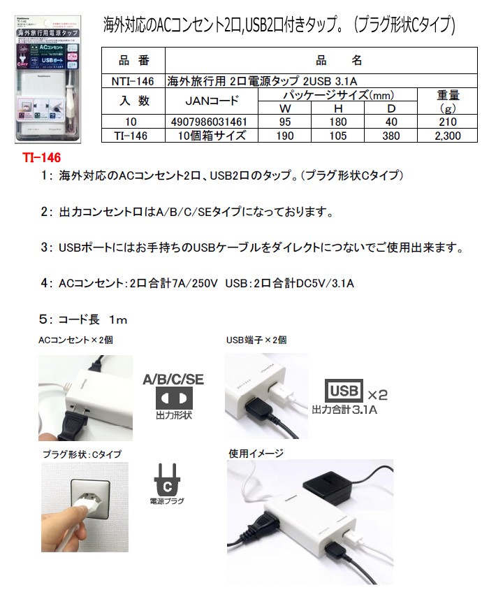 | 【在庫限り!】NTI-146 海外旅行用 2口電源タップ 2USB 3.1A スペック情報 |