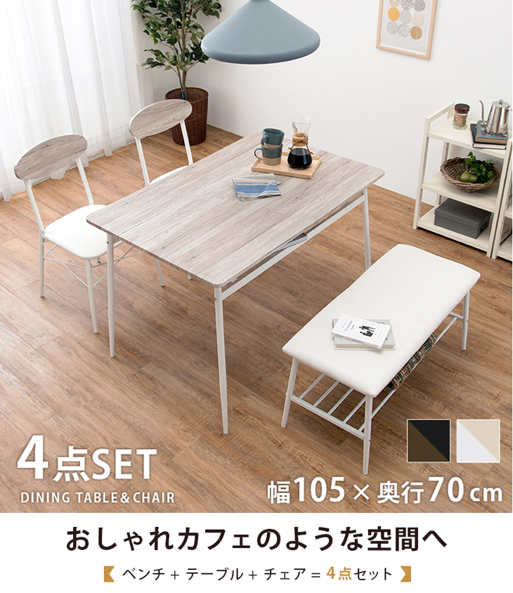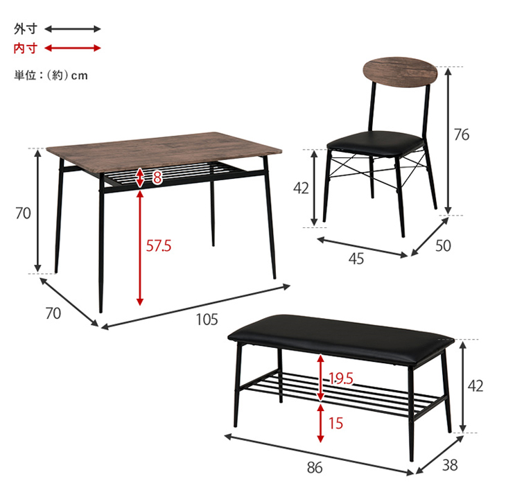 テーブル:幅105×奥行70×高さ70cm、チェアー:幅45×奥行50×高さ76×座面高42cm、ベンチ:幅86×奥行38×高さ42cm