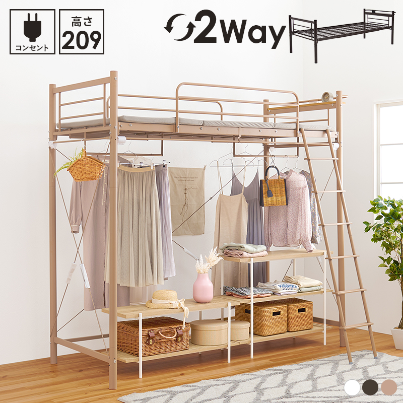 ベッド下の空間に市販のカーテンを取り付け可能なパイプロフトベッド。ハンガーポールもついているので衣類収納としても活躍。ベッド下の空間がウォークインクローゼットや小さなお部屋として使えるスーパーハイタイプ