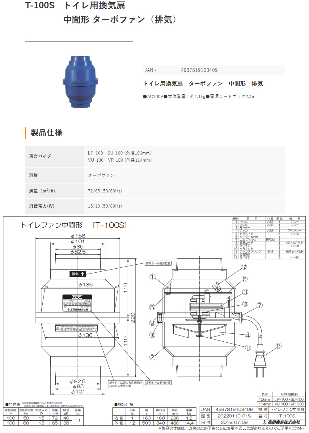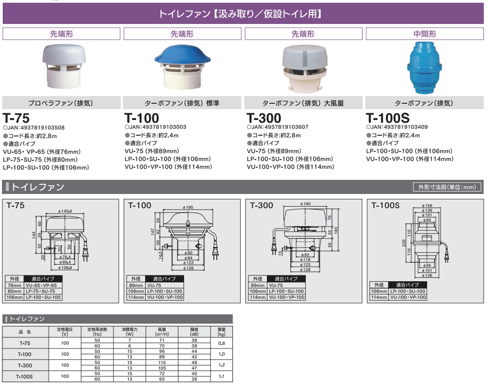 | T-100S トイレ用換気扇 中間形 ターボファン(排気) スペック情報 |