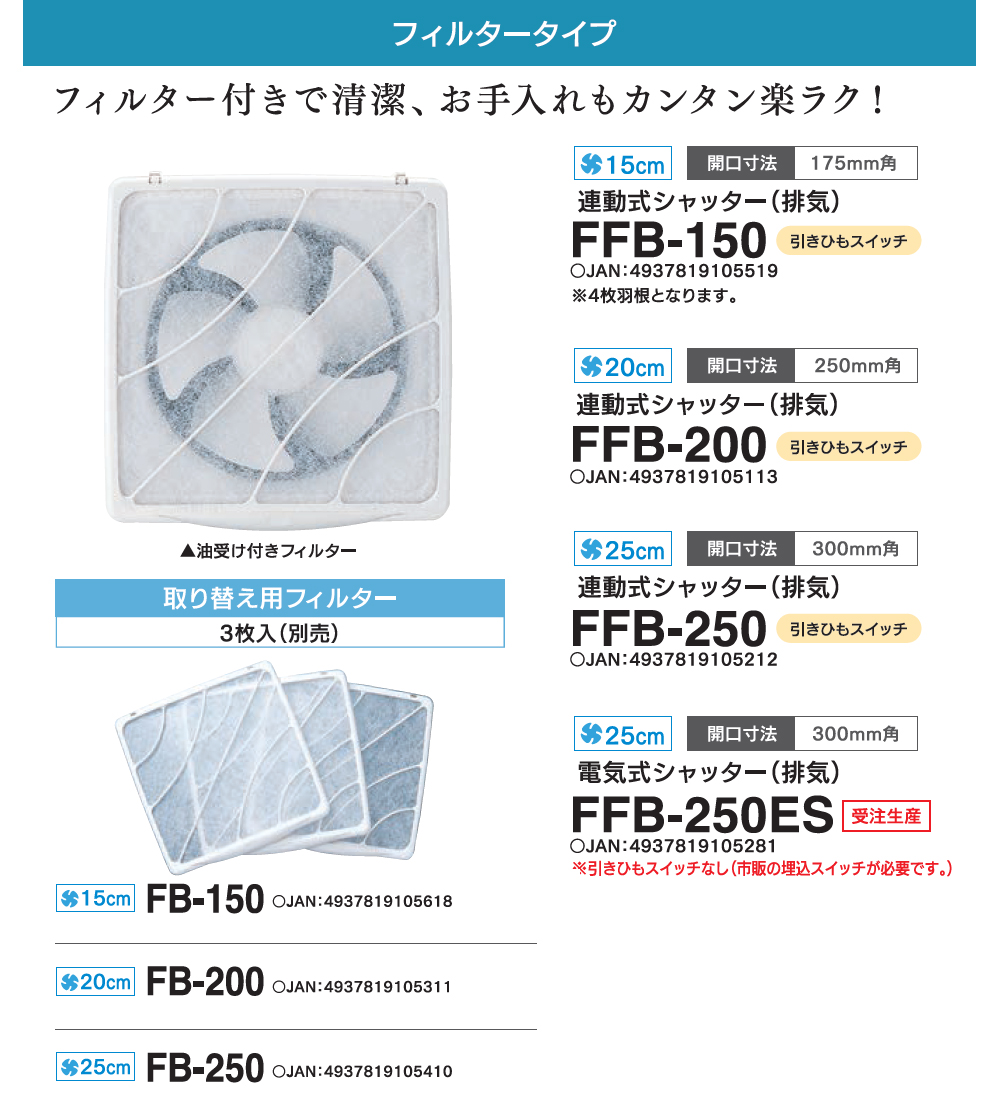 FFB-250用 取り替えフィルター 別売/3枚入●フィルター換気扇FFB-250用
