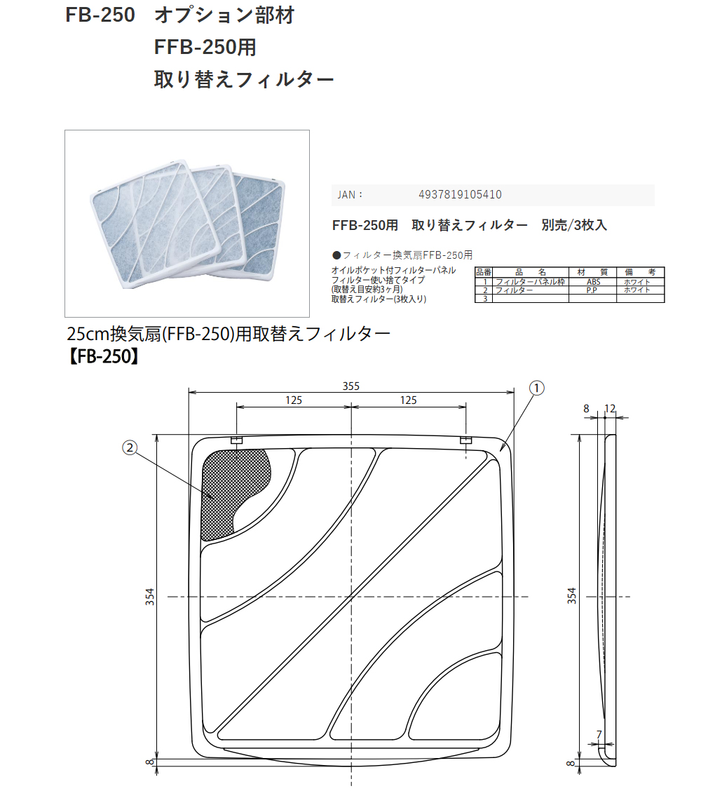 | FB-250 オプション部材 FFB-250用 取り替えフィルター【25cm換気扇用(300×300)】 スペック情報 |