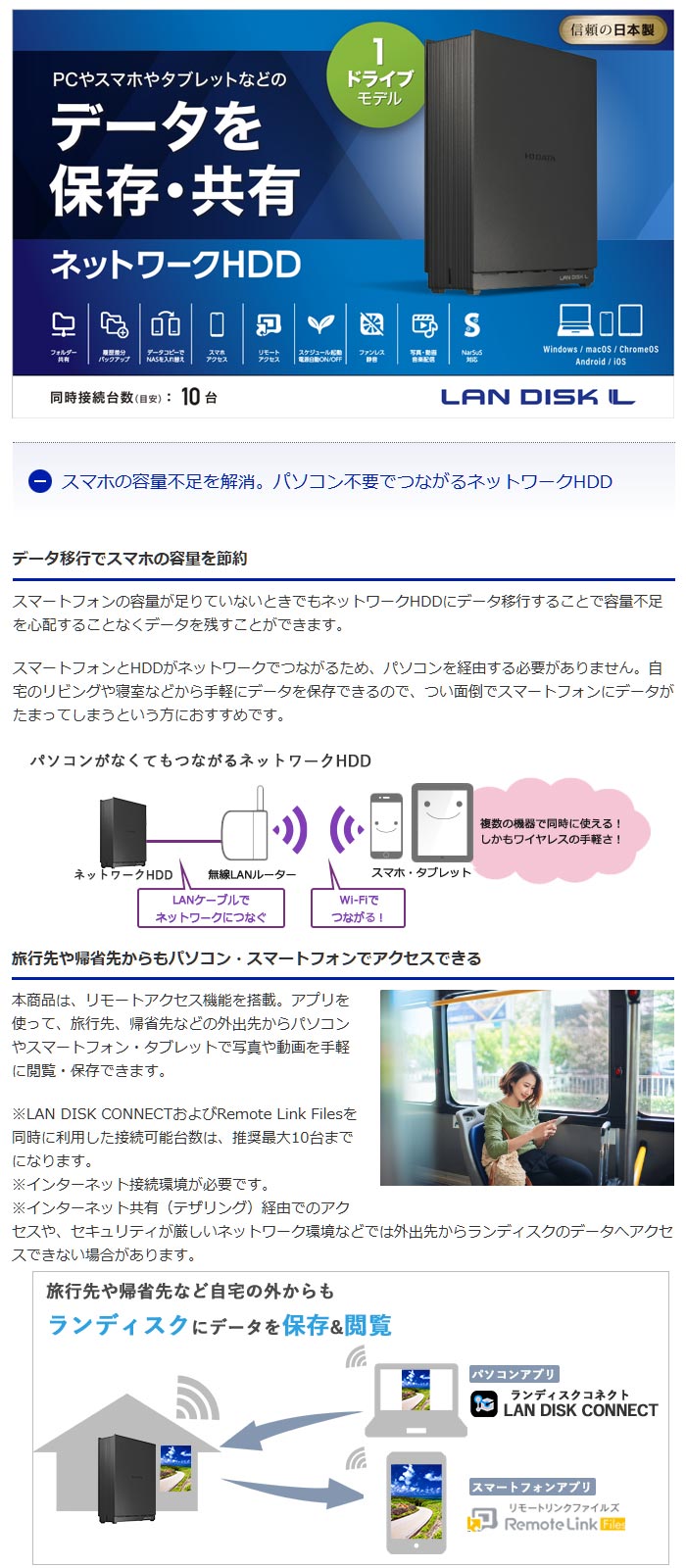 本商品は、スマートフォンやタブレットから直接ケーブルをつながずにデータを保存できるネットワークHDDです。PCを利用することなく大量に溜まってしまった写真・動画などのデータを簡単に移動し保存できます。スマートフォンの容量がひっ迫している方やクラウドサービス利用料が気になる方におすすめです。