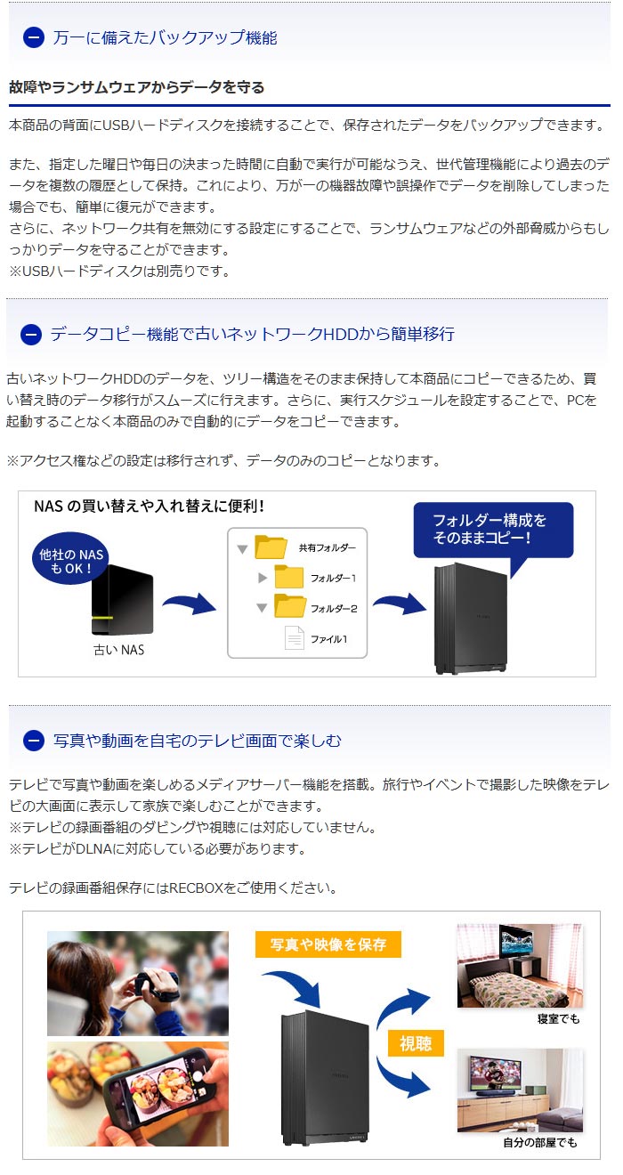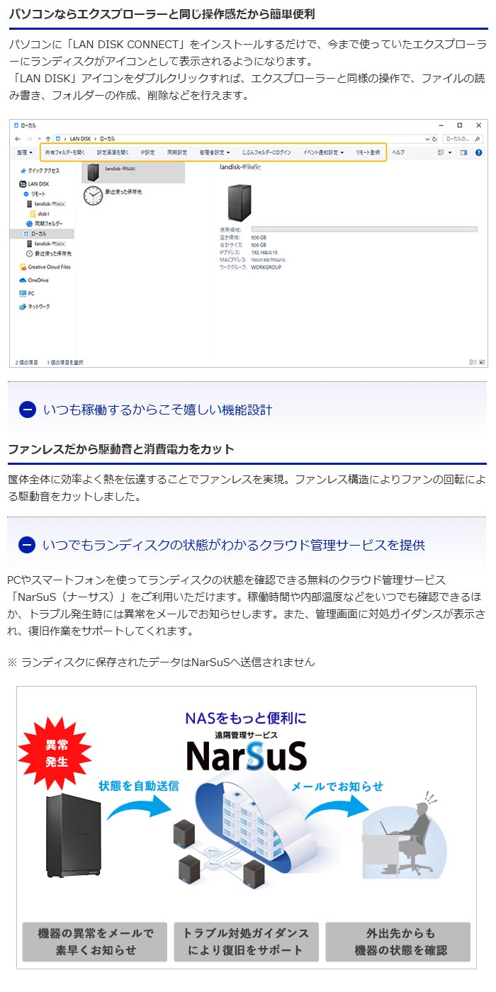 | 機能特徴 | リモートアクセス(Remote Link 3)、NarSuS(別途登録が必要)、メール通知(NarSuSにご登録いただいた場合)、バックアップ(履歴差分バックアップ、データコピー、ネットワークバックアップ)、省電力モード、メディアサーバー、暗号化ボリューム(USBロックキー) |