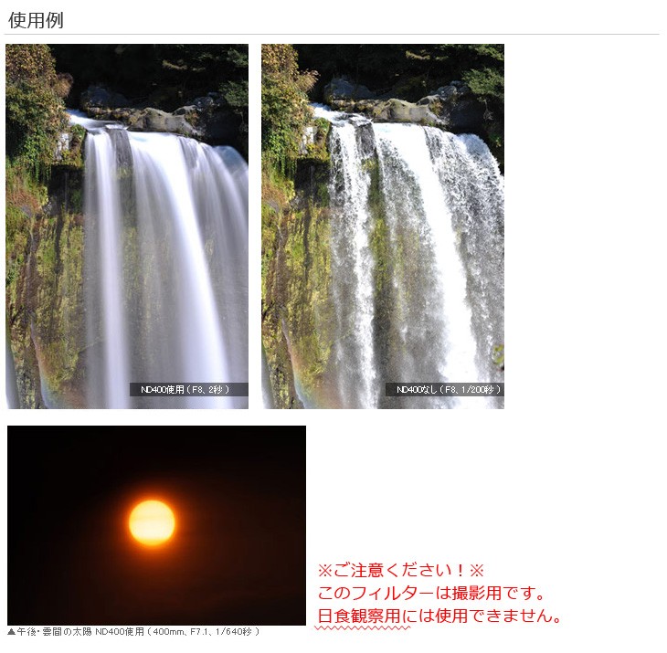 【NDガラスの特性についてのご注意】 ND400プロフェッショナルはNDガラスを使用しているため、黄色味がかかる傾向があります。そのためデジタルカメラではオートホワイトバランスの使用を、フィルムカメラではC4やC8フィルターとの併用をおすすめします。