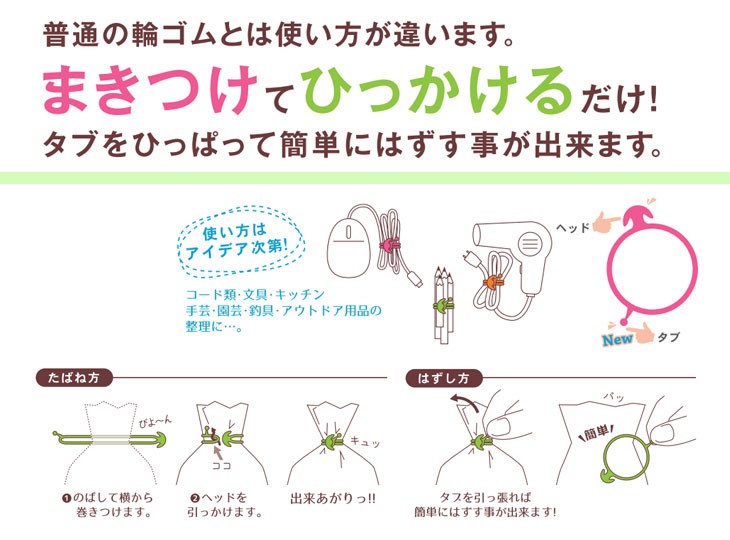 ゴムバンドをまきつけて、かけるだけワンタッチでOK。