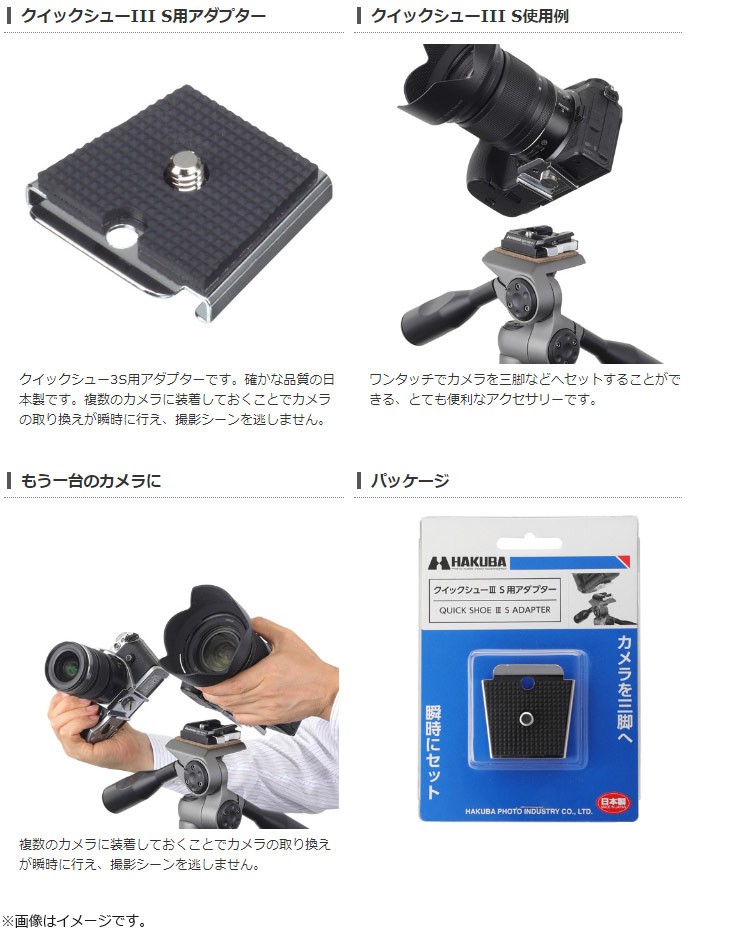 ■クイックシューIII S用アダプタークイックシュー3S用アダプターです。確かな品質の日本製です。複数のカメラに装着しておくことでカメラの取り換えが瞬時に行え、撮影シーンを逃しません。