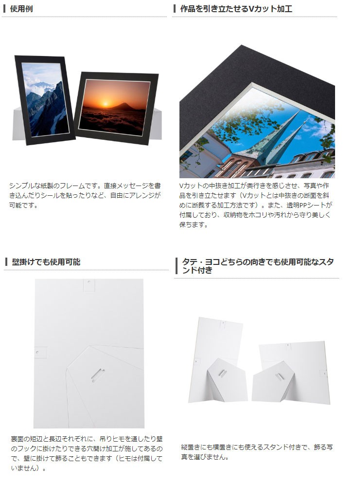 ■作品を引き立たせるVカット加工Vカットの中抜き加工が奥行きを感じさせ、写真や作品を引き立たせます(Vカットとは中抜きの断面を斜めに断裁する加工方法です)。また、透明PPシートが付属しており、収納物をホコリや汚れから守り美しく保ちます。