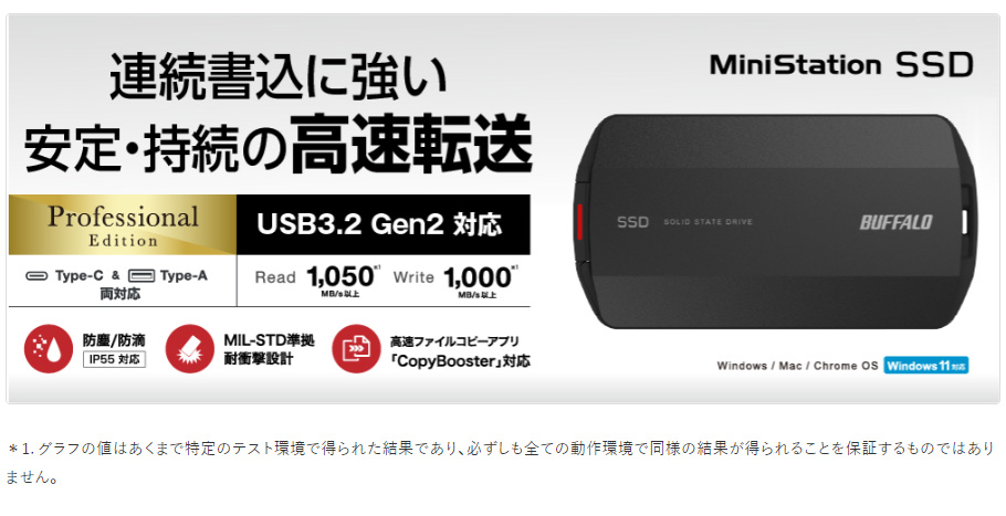 ■屋外への持運びにも安心なIP55(防塵、防滴)機能搭載大切なデータを守る耐衝撃・防塵・防滴仕様です。米国MIL規格「MIL-STD-810H 516.8 procedure IV」準拠。万が一の落下による衝撃から保存されたデータを守ります。