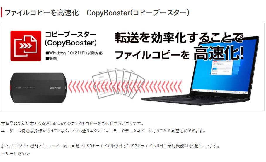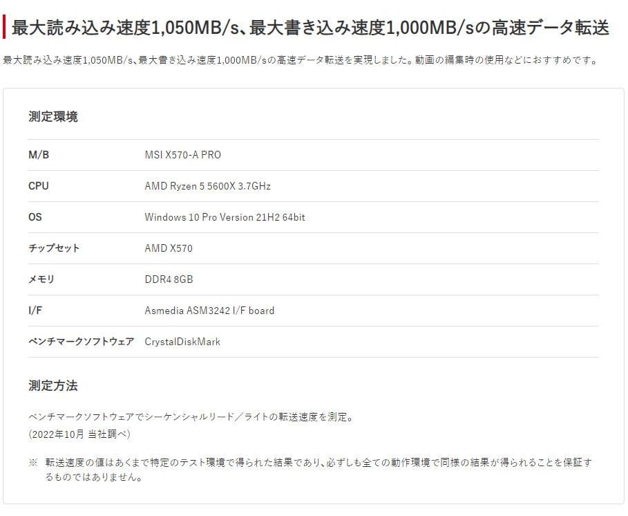 連続書込に強い。安定・持続の高速転送。最大読み込み速度1050MB/s、最大書き込み速度1000MB/sの高速データ転送を実現。