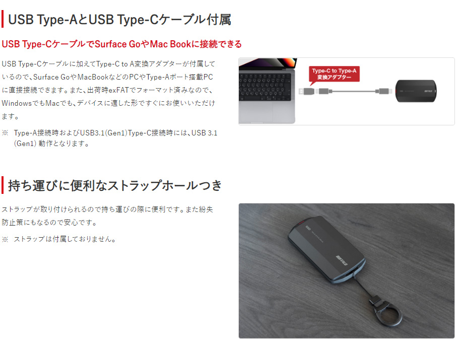| USB3.2(Gen2) ポータブルSSD TypeA&C MiniStation 500GB 耐衝撃 防塵 防滴 Type-C対応 SSD-PHP500U3BA/D スペック情報 |