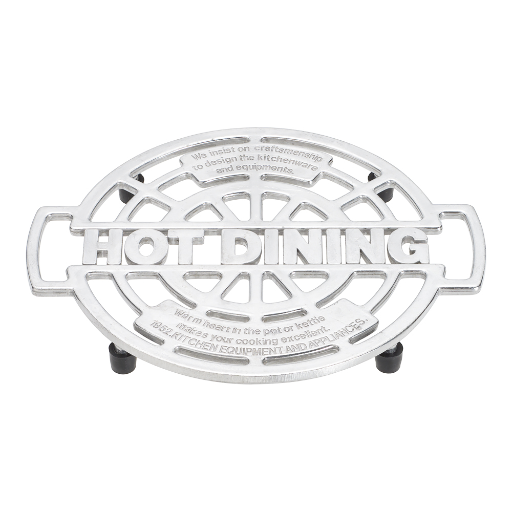 アルミ製の鍋しきです。未使用時もおしゃれなデザイン♪両端が持ち手になっています。脚にゴムキャップがついているのでテーブルを傷つけずに使用できます。サイズ:φ180mm