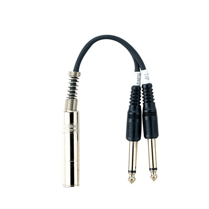 1つのステレオジャックを2本のオス標準モノラルジャックに分岐する変換コネクターケーブル。