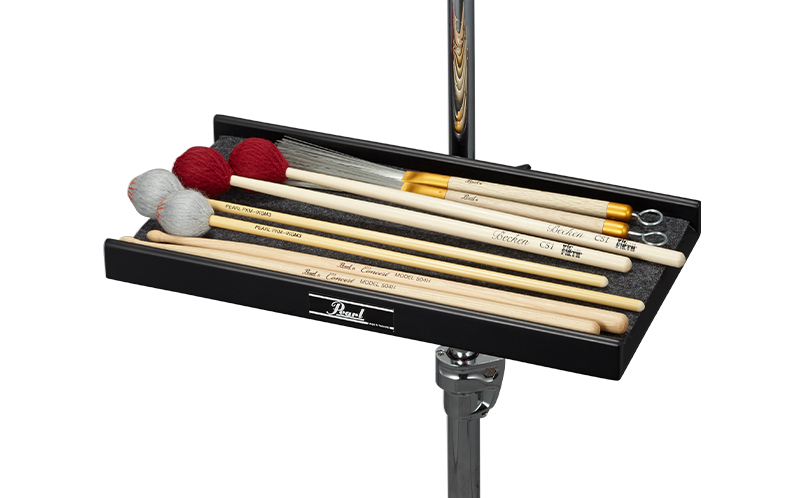 シンバルスタンドにセットできる、クランプ付きのテーブル。演奏中にマレットやスティックの持ち替えがしやすいようにテーブル両側のフチを無くした形状。