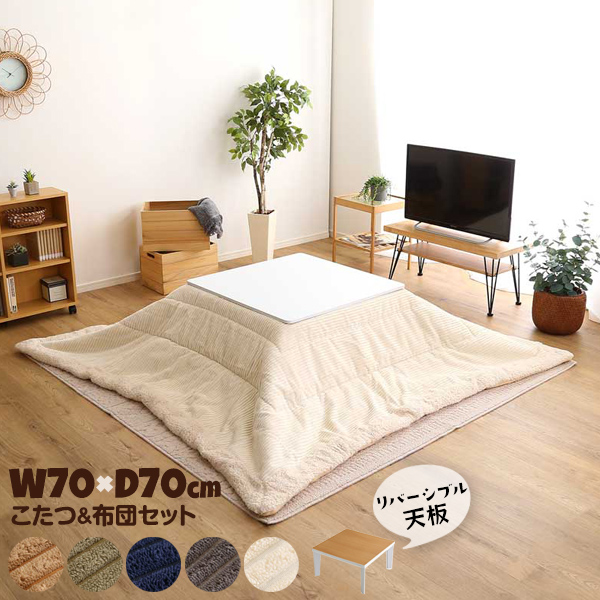 こたつと布団セット 正方形 70×70cm リバーシブル天板 シンプル 木目調 ホワイト こたつ布団 コーデュロイ フリース裏地 1人暮らし 専用炬燵