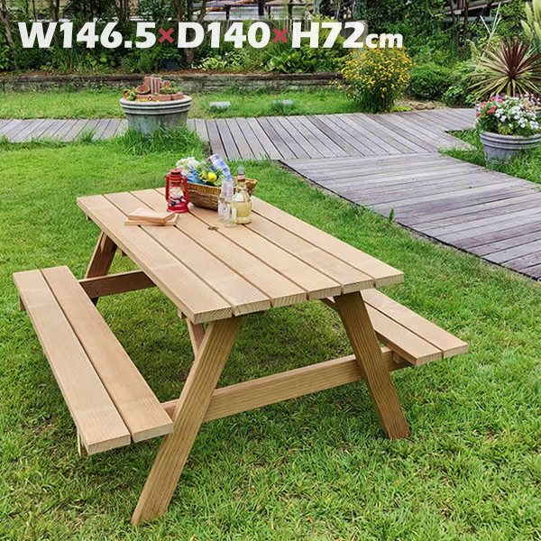 4人掛け 幅1465 奥行1400 高さ720mm ピクニックテーブル 日本製 ニュージーランドパイン アウトドアテーブル BBQ ガーデン 天然木製
