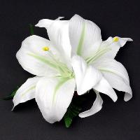 シルクフラワー素材使用のカサブランカ・ヘアクリップです。カサブランカが二つと両サイドにロケラニがあしらわれている、まるで本物のように丁寧に製作されており、舞台映えのするヘアクリップとなっております。