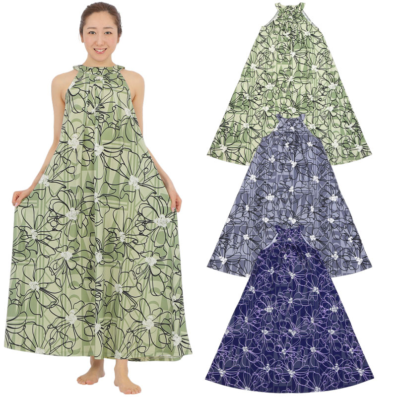 フラダンス 舞台衣装 ラウンドネック ロングドレス ポケット付き ビーチナウパカ柄 フリーサイズ リゾートワンピ