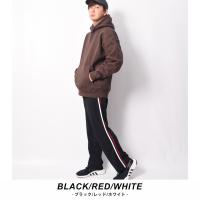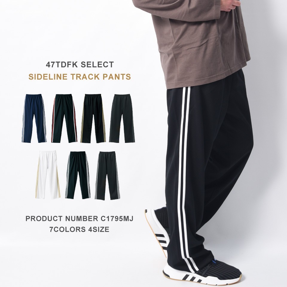 裾はリブなし太めのストレートタイプにラインパンツ。