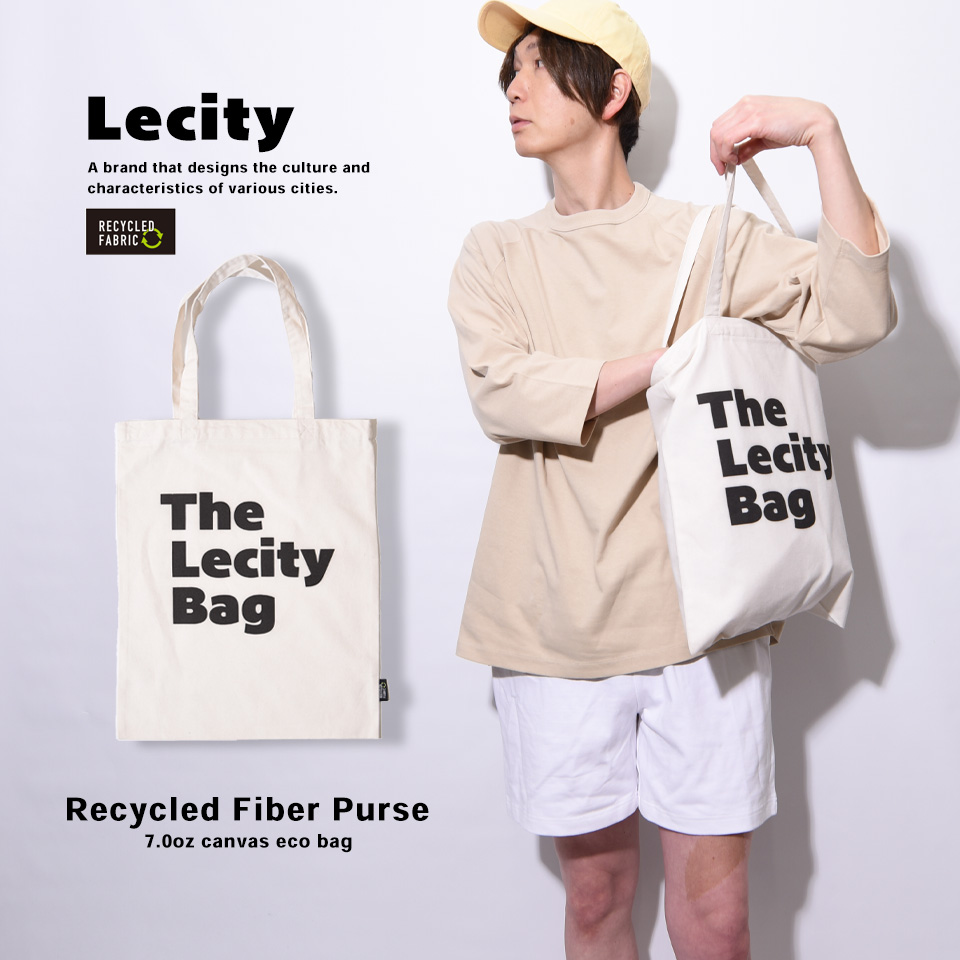 リサイクルコットンを使用したキャンバストートバッグ。 男女問わずジェンダーレスで使いまわしが出来るデザインで、Lecityのロゴをあしらった1枚。リサイクルコットンと再生ポリエステルは廃棄予定の裁断くずや生地を回収し、水や染料、化学薬品を使用せず新しい糸を生み出しているので、二酸化炭素の排出削減にも貢献しています。またプリント部分は水を一切利用しないインクジェットプリントで行っているため、環境に優しい加工方法です。