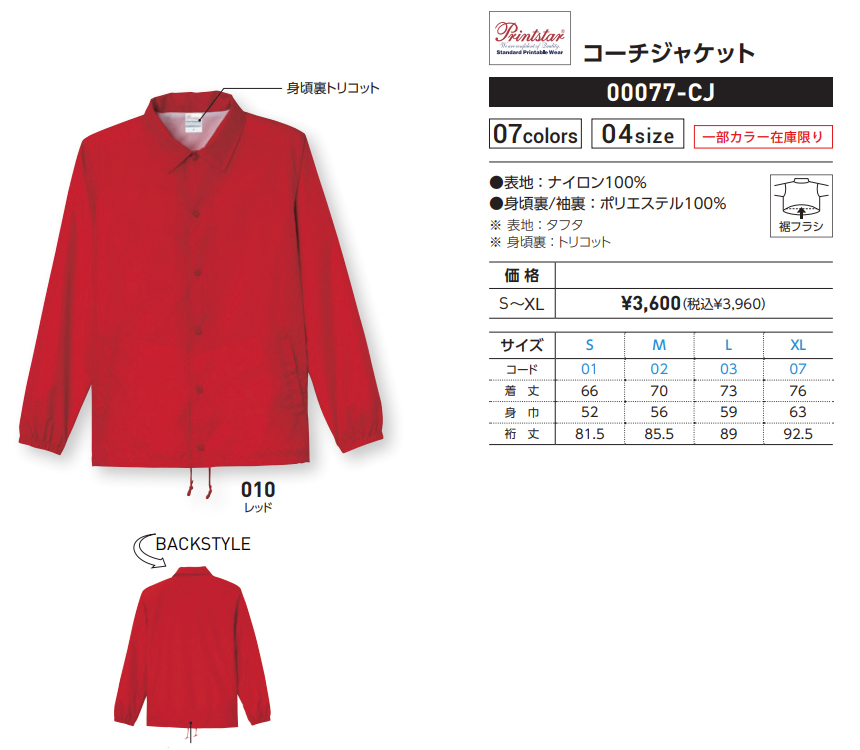 Printstar(プリントスター)のコーチジャケットのご紹介です。