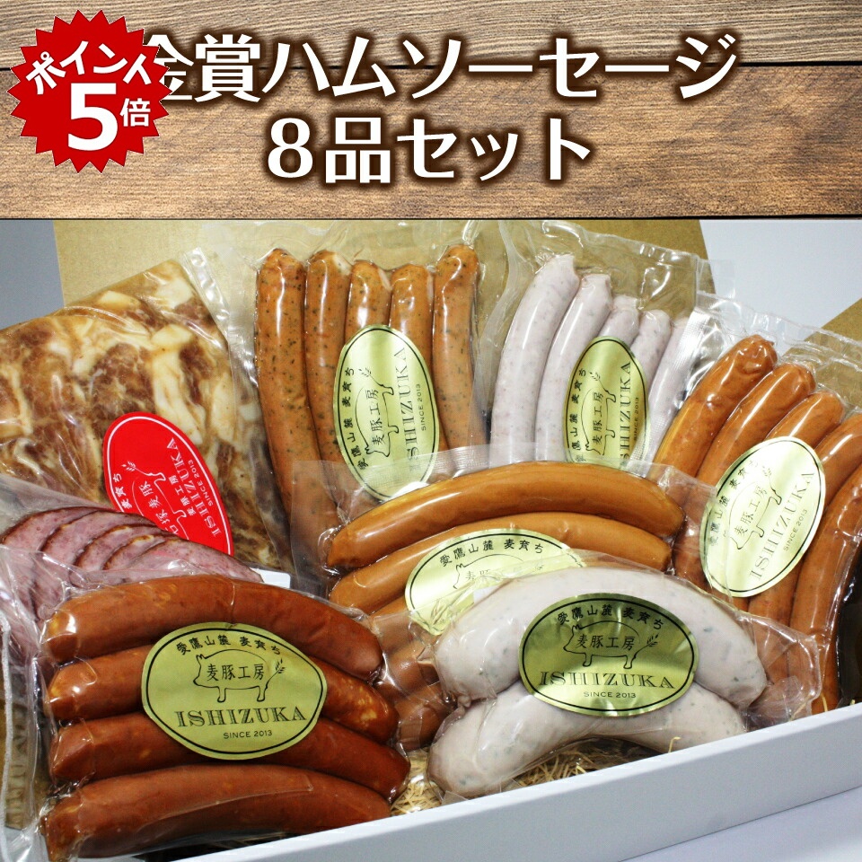 | 名称 | 金賞ハムソーセージ8品セット (プレミアム粗挽きウィンナー170g、チューリンガー170g、ガーリックバジル170g、ポークウィンナー150g、チョリソー140g、白ウィンナー140g、ポークソフトサラミ60g、こまみそ漬け肉200g) |