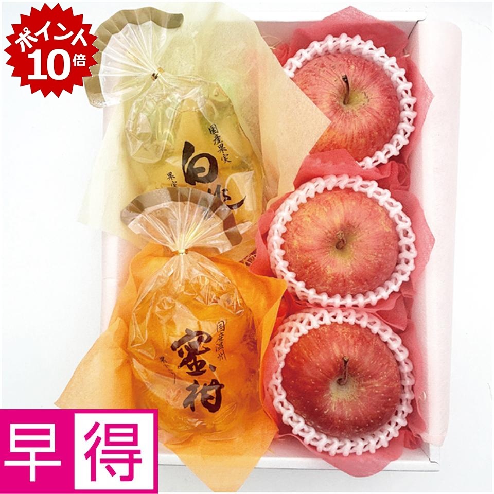 青森県産ふじりんご3個(1個300g以上)、みかんゼリー1袋(400g)、白桃ゼリー1袋(400g)※サイズ指定はご容赦ください。