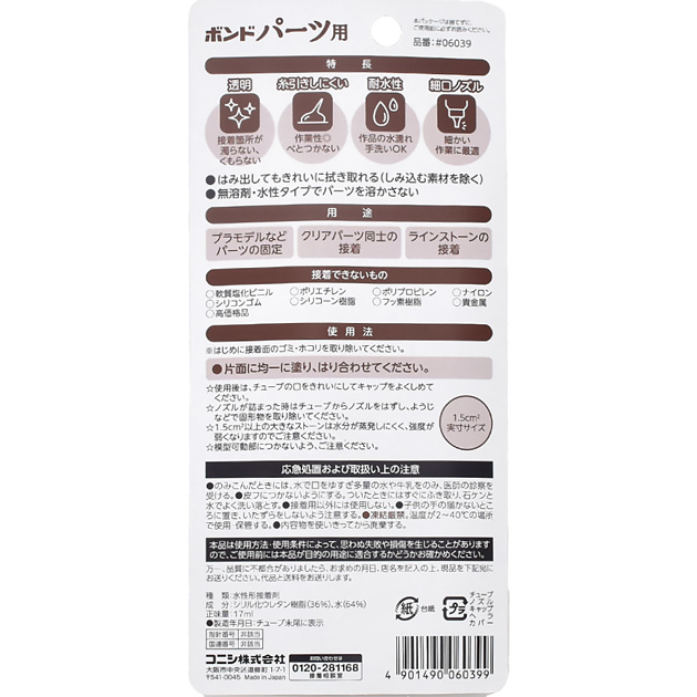 | ■ご注意 | ・使用後は、チューブの口をきれいにしてキャップをよくしめてください。 ・ノズルが詰まった時はチューブからノズルをはずし、ようじなどで固形物を取り除いてください。 ・1.5?以上の大きなストーンは水分が蒸発しにくく、強度が弱くなりますのでご注意ください。 ・模型可動部につかないよう、ご注意ください。 ・のみこんだときには、水で口をゆすぎ多量の水や牛乳をのみ、医師の診察を受けてください。 ・皮フにつかないようにしてください。ついたときにはすぐにふき取り、石ケンと水でよく洗い落とす。 ・接着用以外には使用しないでください。 ・子供の手の届かないところに置き、いたずらをしないよう注意してください。 ・内容物を使い切ってから廃棄してください。 ※凍結厳禁 温度が2〜40℃の場所で使用・保管してください。 その他、パッケージの注意事項を必ずご確認の上、ご利用ください。 上記のご了承の上、お買い求めお願い申し上げます。 |
