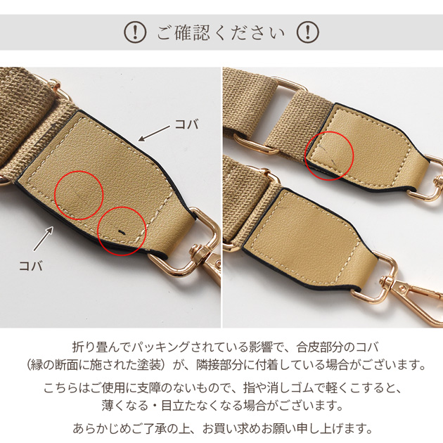 | ■ご注意 | ・生産ロットにより、ショルダーの長さが少し長い場合がございます。 ・持ち手部分に関しまして、生産ロットによって硬さやお色が若干変わる場合がございます。また、お洗濯をしますと色移りする可能性がございます。 ・ナスカンに関しまして、開閉の固さには個体差がございます。また、小キズや色ムラ等がある場合がございます。これらは生産工程上避けることのできない仕様となります。予めご理解ください。 ・ロットごとに色合いが異なる場合がございます。その場合のご返品はお受けすることができませんのでご了承ください。 ・画像では100%同じお色を表現することが出来ません。実際のお色味より若干異なる場合がございます。 上記の理由での返品・交換を承ることは出来ません。 予めご了承の上、お買い求めお願い申し上げます。 |