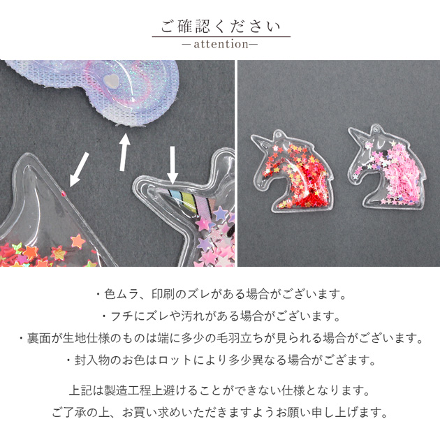 | ■ご注意 | ・色ムラ、印刷のズレがある場合がございます。 ・フチにズレがある場合がございます。 ・裏面が生地仕様のものは端に多少の毛羽立ちが見られる場合がございます。 ・在庫の関係により画像のセット内容とカラーが異なる場合がございます。 ・洗濯可能でございますが、お洗濯をする場合はネットに入れてお洗濯することをおすすめいたします。ご利用方法によっては、取れる場合がございます。乾燥機はご利用頂けません。 ・ご利用のボンドの種類や生地の種類によっては、接着できな場合がございます。 ・多少のキズや凸凹、ちょっとした汚れのようなものなどが見られる場合がございます。 ・画像では100%同じお色を表現することができません。実際のお色味と若干異なる場合がございます。