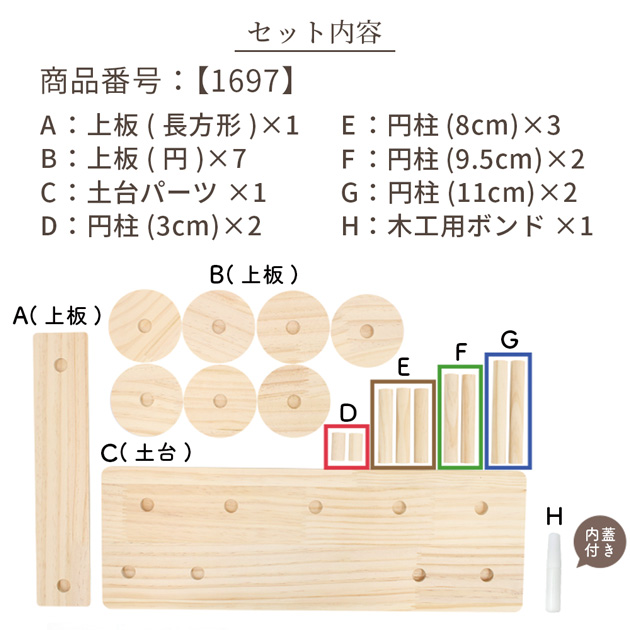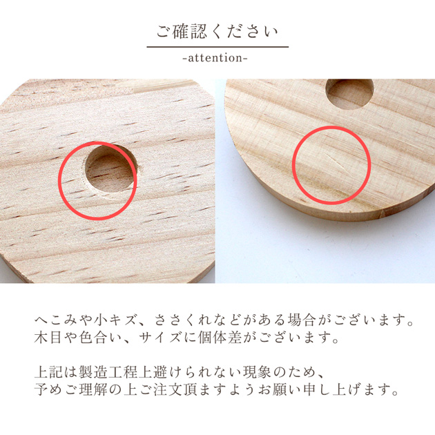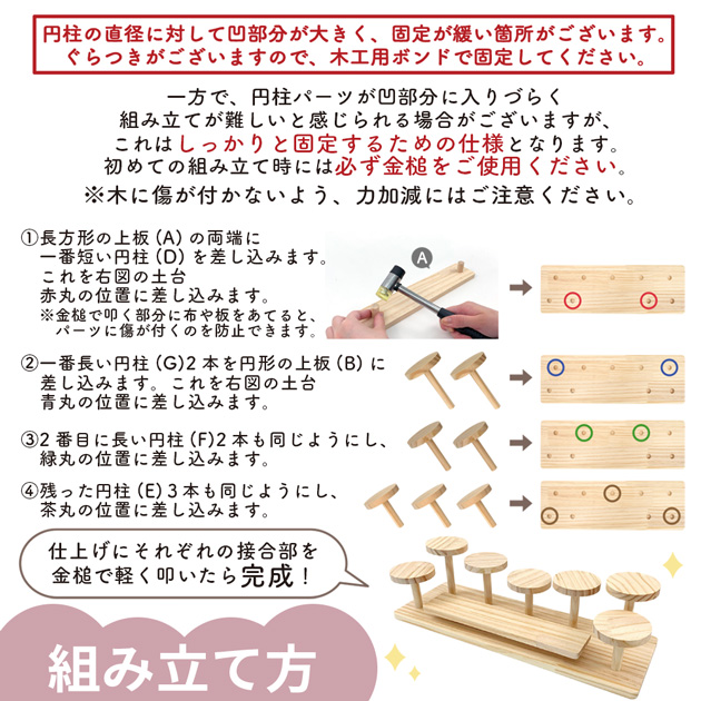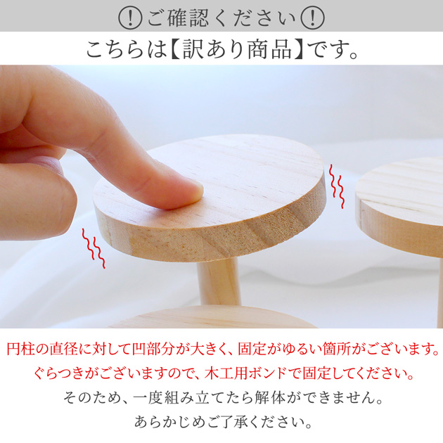 | ■商品の仕様 | ・組立式。説明書付き。 ・お届けはパーツでお届けとなります。組み立ててご利用ください。 ・組み立てには金槌を1本ご用意ください。 ・円柱の直径に対して凹部分が大きく、固定がゆるい箇所がございます。 ぐらつきがございますので、木工用ボンドで固定してください。 ・木製です。木目や色合い、サイズに個体差がございます。 ささくれ等がある場合は、やすり等で滑らかにしてご利用ください。 天然素材のため、保管環境やご使用環境により変形やサイズの変化が見受けられる場合がございます。 上記、ご理解の上、お買い上げください。これらは返品交換対象外となります。 |