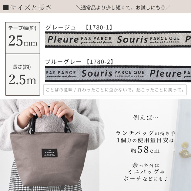 | ■ご注意 | ・既にカット済みの商品となります。複数ご購入いただきましても、カットした状態でのお届けとなります。 ・途中で切れ、2本に分かれる場合がございます。その場合には長めに入れさせていただきます。 ・テープ面に多少の汚れがございます。 ・ロゴの部分は、製造工程上、かすれている場合がございます。 ・強い摩擦をかけるとロゴの部分が剥がれる場合があります。 ・プリントインクの匂いが強い場合がございます。ベランダ等の風が通る場所にて陰干しいただけますと徐々に和らいでまいります。 ・ロットごとに色合いや質感が異なる場合がございます。 ・画像では100%同じお色を表現することが出来ません。実際のお色味より若干異なる場合がございます。 上記の理由での返品・交換を承ることはできません。 予めご了承の上、お買い求めお願い申し上げます。 |