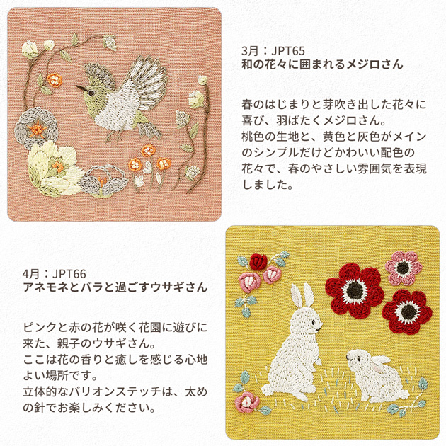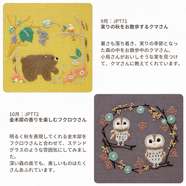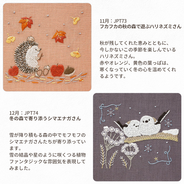 | ■商品番号 | 【JPT63】雪にワクワクするエゾリスさん 【JPT64】冬の空を舞うエゾモモンガさん 【JPT65】和の花々に囲まれるメジロさん 【JPT66】アネモネとバラと過ごすウサギさん 【JPT67】白鳥さんの秘密の湖 【JPT68】雨上がりと花の香りに喜ぶ小鹿さん 【JPT69】小川のキラキラを眺めるキツネさん 【JPT70】シマリスさんのお気に入りの場所 【JPT71】実りの秋をお散歩するクマさん 【JPT72】金木犀の香りを楽しむフクロウさん 【JPT73】フカフカの秋の森で遊ぶハリネズミさん 【JPT74】冬の森で寄り添うシマエナガさん |