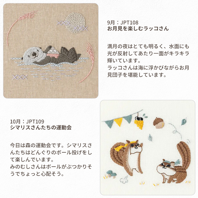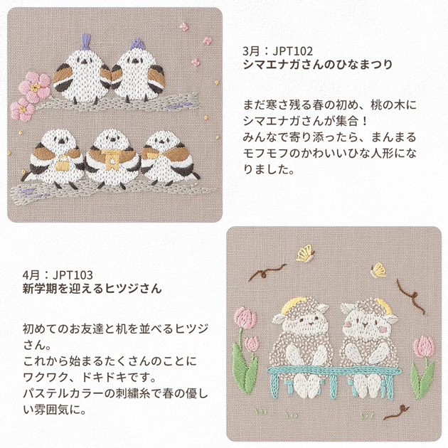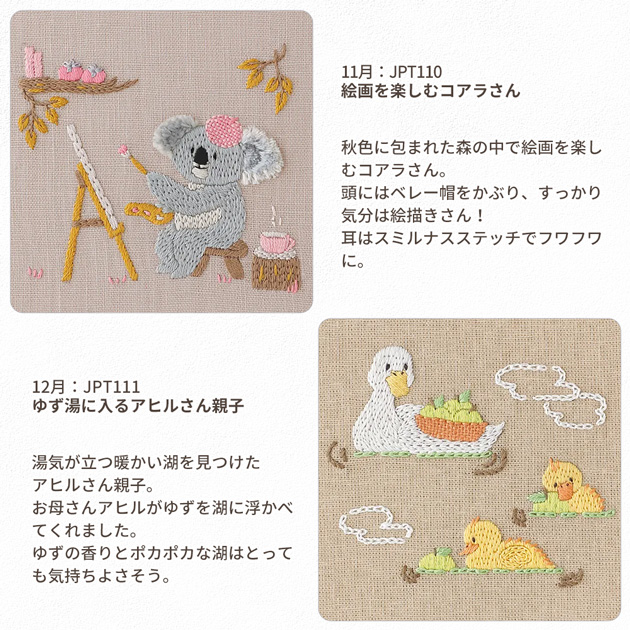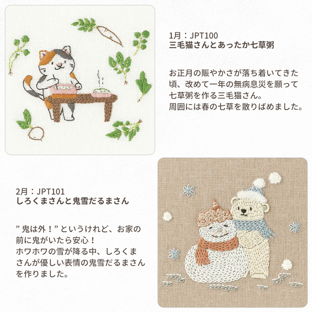| ■商品番号 | 【JPT100】三毛猫さんとあったか七草粥 【JPT101】しろくまさんと鬼雪だるまさん 【JPT102】シマエナガさんのひなまつり 【JPT103】新学期を迎えるヒツジさん 【JPT104】ハリネズミさんと鯉のぼり 【JPT105】梅雨の日のルリビタキさんとカエルさん 【JPT106】七夕に願い事をするパンダさん 【JPT107】ナマケモノさんの夏休み 【JPT108】お月見を楽しむラッコさん 【JPT109】シマリスさんたちの運動会 【JPT110】絵画を楽しむコアラさん 【JPT111】ゆず湯に入るアヒルさん親子 |