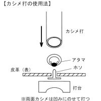 | ■ワンポイントアドバイス | ・あける穴 のサイズ:2mm程度 ・布の厚み(革)+2〜3mm程度でカシメの足の長さをお選び下さい。 長すぎると、打ちつける際にカシメの足が曲がりやすくなりますのでご注意下さい。 |