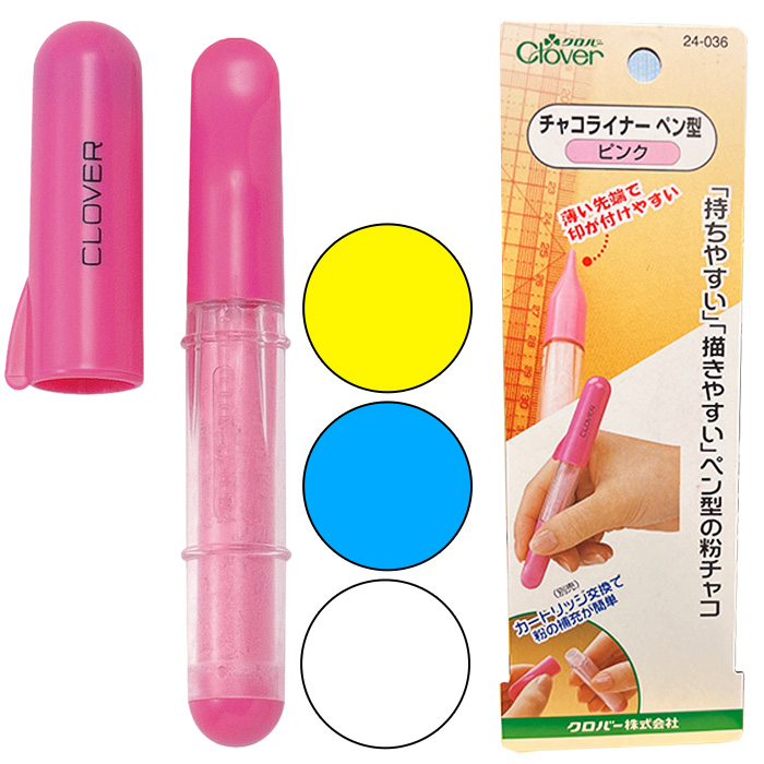 | ■ご注意 | チャコライナーペン型は、できるだけ垂直に近い状態でお使い下さい。(横に傾けますぎると粉が出にくくなります) ・ご使用前に必ず布端などで。印が消えるかどうかお試し下さい。 (※水洗いができない布地への印つけは、お避け下さい) ・印を消さずにアイロンを当てたり、ドライクリーニングをすると、消えない場合がございますのでご注意下さい。 ・粉が残っている間は、先端部と透明カートリッジ部をはずさないでください。粉がこぼれる恐れがあります。 ・ご使用後はキャップをしっかり閉めて保管して下さい。 ・お子様の手の届かない所に保管して下さい。 その他、パッケージの注意事項をご確認の上、ご利用ください。 |