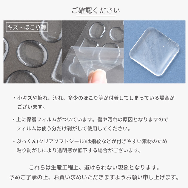 | ■ご注意 | ・小キズや擦れ、汚れ、ほこり等が付着している場合がございます。 ・上に保護フィルムがついています。傷や汚れの原因となりますので、フィルムは使う分だけ剥がして使用してください。 ・指紋などがつきやすい素材のため、貼り剥がしにより透明感が低下する場合がございます。 ・樹脂素材のため、日焼け等により変色する場合があります。 ・小さなお子様の手の届かない場所で保管してください。