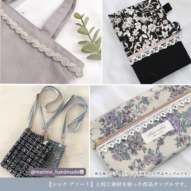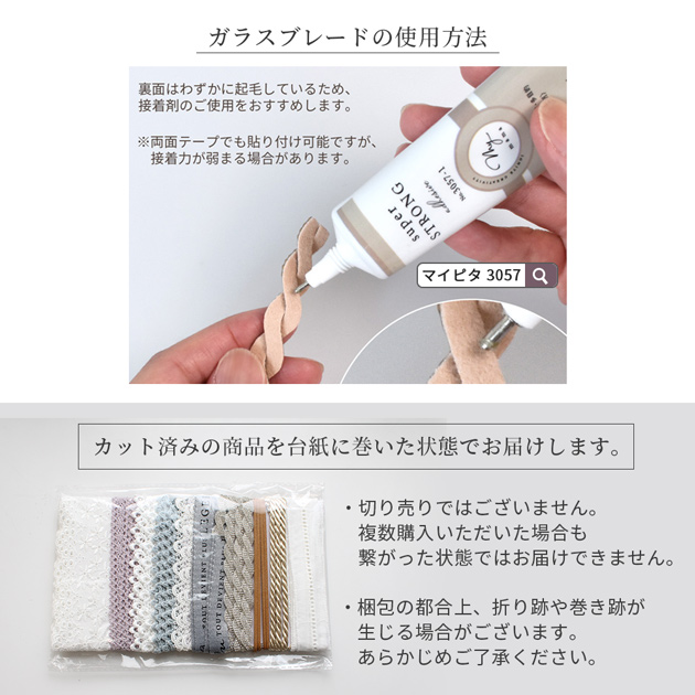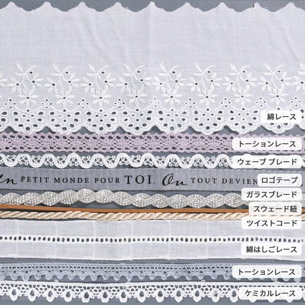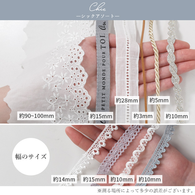 | ■セット内容・数量 | 各1本×10種 ・綿はしごレース はしご約5mm 幅約28mm ・ツイストコード 光沢あり/シャンパンゴールド 約5〜6mm幅 ・スウェード紐(キャメル) 約3mm幅 ・編み込み ガラスブレード(シルバー) 10mm幅 ・デザイン ロゴ 持ち手テープ(ブルーグレー) 15mm幅 ・ウェーブ ブレード(ホワイト) 約10mm幅 ・ピコトーションレース(ミストブルー) 約10mm幅 ・ケミカルレース プティ フイユ 約14mm幅 ・プチチロリアン トーションレース(ラベンダー) 約15mm幅 ・綿レース 約90mm幅 |