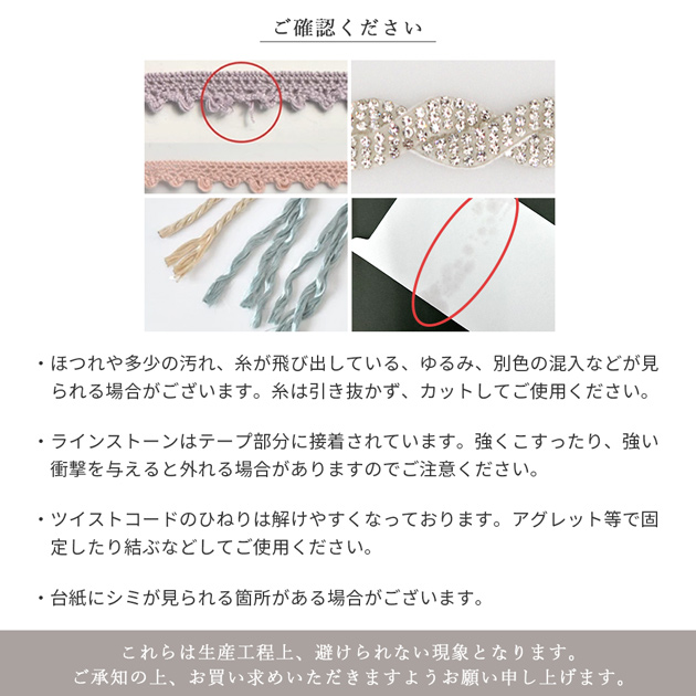 | ■ご注意 | ・ほつれや多少の汚れ、糸が飛び出している、糸のゆるみなどが見られる箇 所がある場合がございます。糸は引き抜かず、カットしてご使用ください。 ・ラインストーンはテープ部分に接着されています。強くこすったり、強い 衝撃を与えると外れる場合がありますのでご注意ください。 ・ツイストコードのひねりは解けやすくなっております。カットする際にひねりが緩みますので、テープで固定したり結ぶなどしてご使用いただく仕様となっております。 ・カット済みの商品となります。複数ご購入いただいた場合でも、つなげてお届けすることは出来ません。 ・台紙に巻いてお送りのため、多少の皺や折れがあるがございます。 ・台紙にシミが見られる箇所がある場合がございます。 ・生産ロットによりお色や幅等が異なる場合がございます。 ・画像では100%同じお色を表現することが出来ません。出来る限り実物に近いお色になるよう心がけておりますが、イメージと異なる場合がございます。 上記の理由での返品交換は承ることが出来ません。 ご了承の上、お買い求めいただきますようお願い申し上げます。 |
