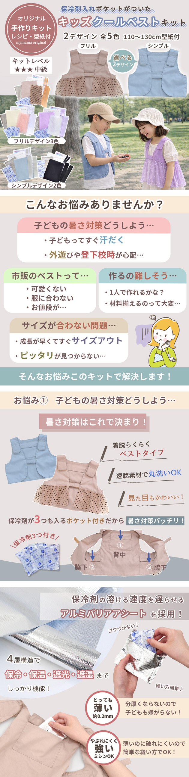 冷却グッズ 冷却ベスト 手作りキット ひんやり 下校 熱中症対策 外遊び 登校 可愛い おしゃれ フリル ベスト ユニセックス 女の子 男の子 暑さ対策 グッズ 手芸 ハンドメイド 生地 LV3 中級
