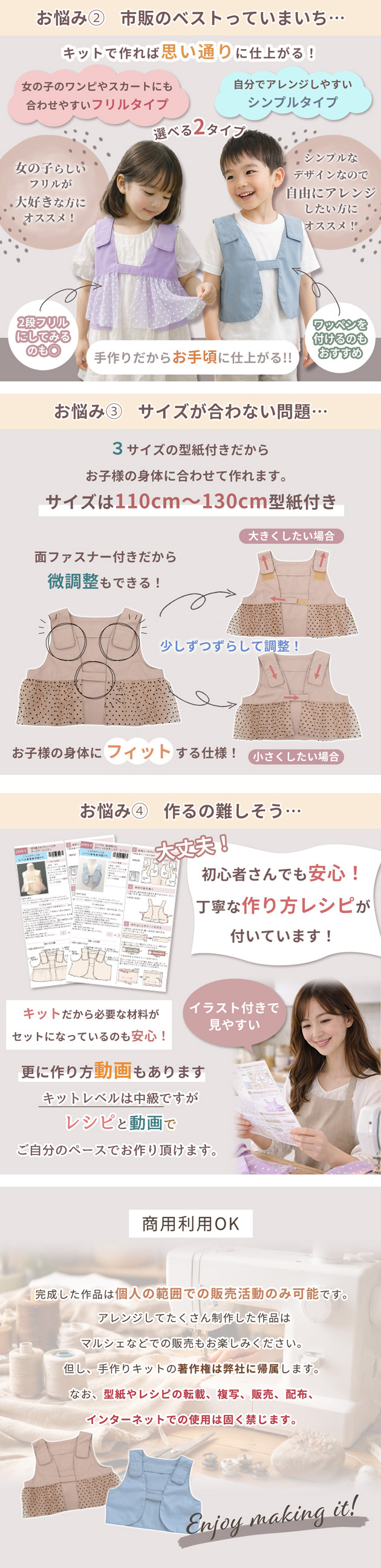 フリルタイプとシンプルタイプ、お好みに合わせて選べる2デザインをご用意。110〜130cm対応の型紙付きで、