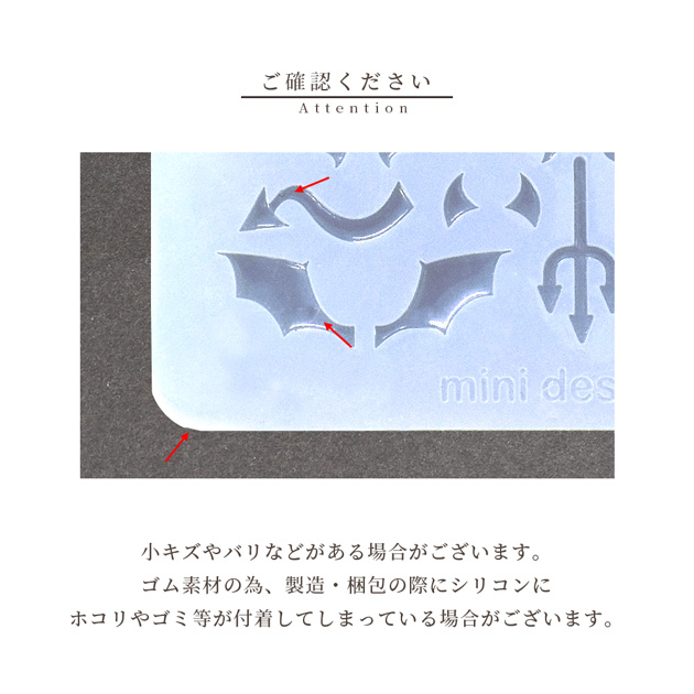 | ■ご注意 | ・シリコンモールドにバリや細かいキズ、歪み等がある場合がございます。 ・ゴム素材の為 製造・梱包の際にシリコンにホコリやゴミ等が付着してしまっている場合がございます。手作業での梱包の為完全に綺麗な状態でのパックは難しく、ご理解の上、お買い求めいただきますようお願い申し上げます。 ・レジン硬化後にモールドから抜きにくい場合がございます。拭き取り液などを隙間になじませますと取り出しやすくなります。 ・ご使用のレジン液により出来上がりの大きさがシリコンのサイズと異なる場合がございます。 上記の理由での返品交換は承ることは出来ません。 | |