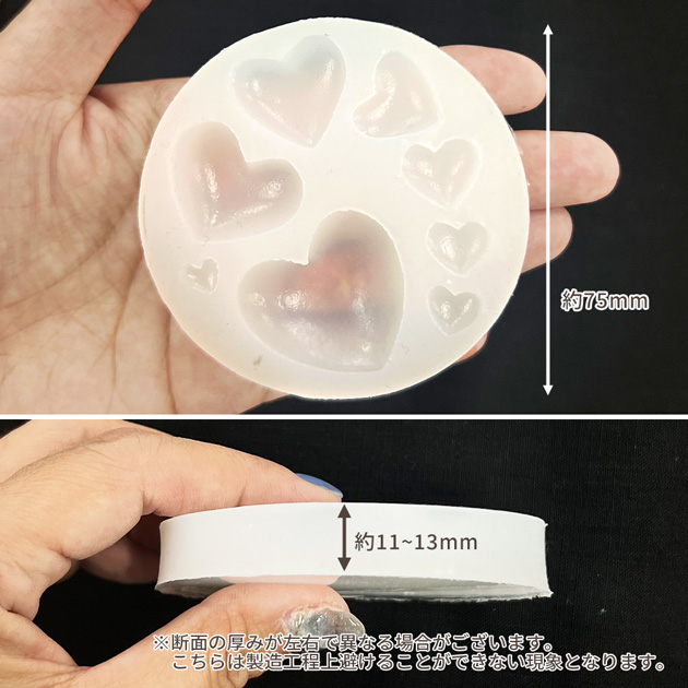 | ■ご注意 | ・シリコンモールドにバリや細かいキズ、歪み等がある場合がございます。 ・ゴム素材の為 製造・梱包の際にシリコンにホコリやゴミ等が付着してしまっている場合がございます。手作業での梱包の為完全に綺麗な状態でのパックは難しく、ご理解の上、お買い求めいただきますようお願い申し上げます。 ・レジン硬化後にモールドから抜きにくい場合がございます。拭き取り液などを隙間になじませますと取り出しやすくなります。 ・ご使用のレジン液により出来上がりの大きさがシリコンのサイズと異なる場合がございます。 上記の理由での返品交換は承ることは出来ません。 | |