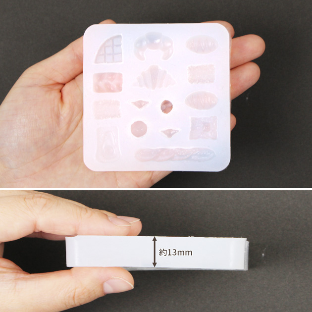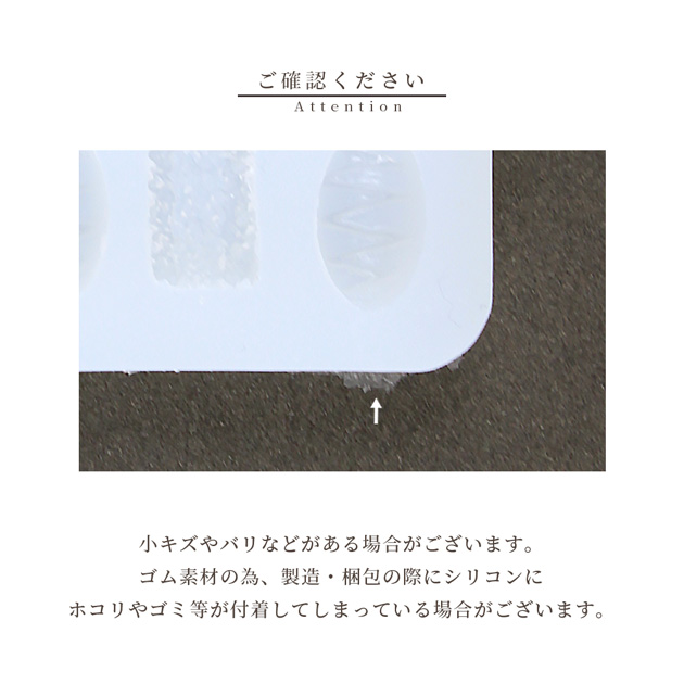 | ■ご注意 | ・シリコンモールドにバリや細かいキズ、歪み等がある場合がございます。 ・ゴム素材の為 製造・梱包の際にシリコンにホコリやゴミ等が付着してしまっている場合がございます。手作業での梱包の為完全に綺麗な状態でのパックは難しく、ご理解の上、お買い求めいただきますようお願い申し上げます。 ・シリコンの厚みには個体差があります。また、厚みは均等でない場合がございます。 ・レジン硬化後にモールドから抜きにくい場合がございます。拭き取り液などを隙間になじませますと取り出しやすくなります。 ※滑らかな仕上がりでない場合は再度表面に薄くレジン液またはレジンコーティング液を塗っていただきますと綺麗な仕上がりになります。 ・ご使用のレジン液により出来上がりの大きさがシリコンのサイズと異なる場合がございます。 上記の理由での返品交換は承ることは出来ません。 | |