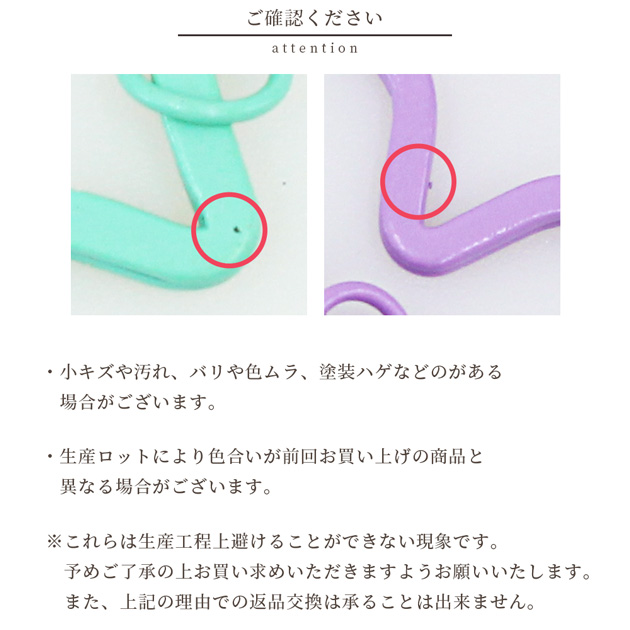 | ■ご注意 | ・小キズや汚れ、バリ、色ムラ、塗装のハゲなどがある場合がございます。 ・無理に過度の力を加えると変形や破損につながる場合がございます。工具などを使う際に染色が剥がれる場合がございます。 作業の際にはお気を付けください。 ・生産ロットによりお色・サイズが異なる場合がございます。前回お買い上げの商品と異なる場合がございます。 ・画像では100%同じお色を表現することができません。出来る限り近いお色になるよう心掛けておりますが、お色のイメージが異なる場合でのご返品は承ることができません。 上記の理由での返品交換は承ることは出来ません。 |