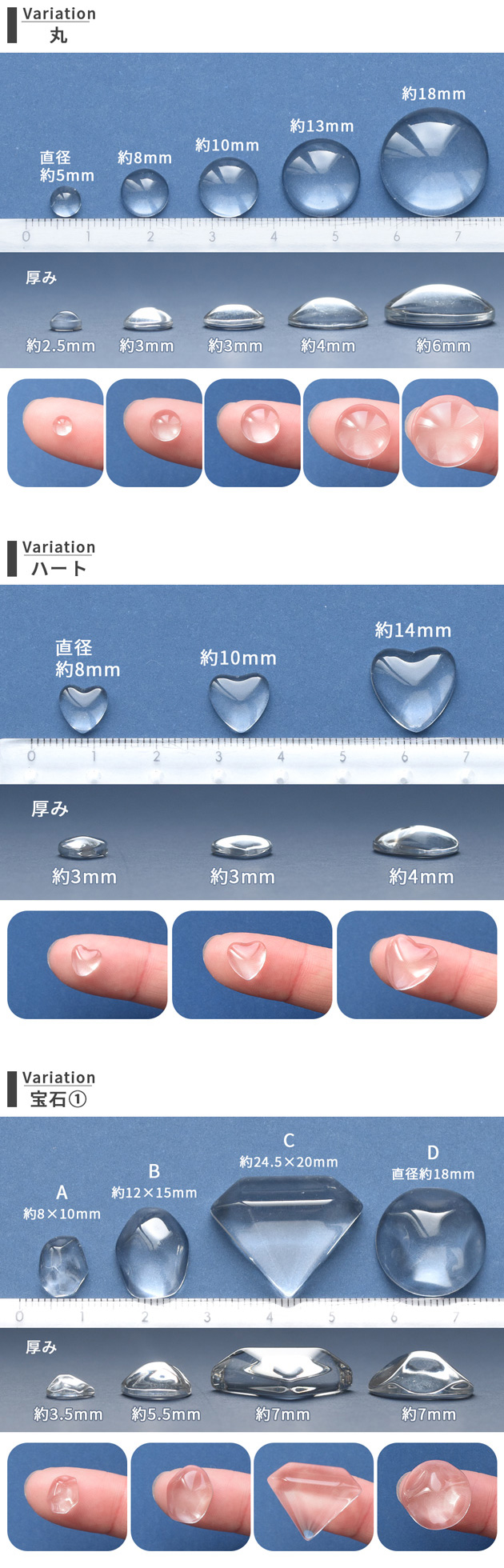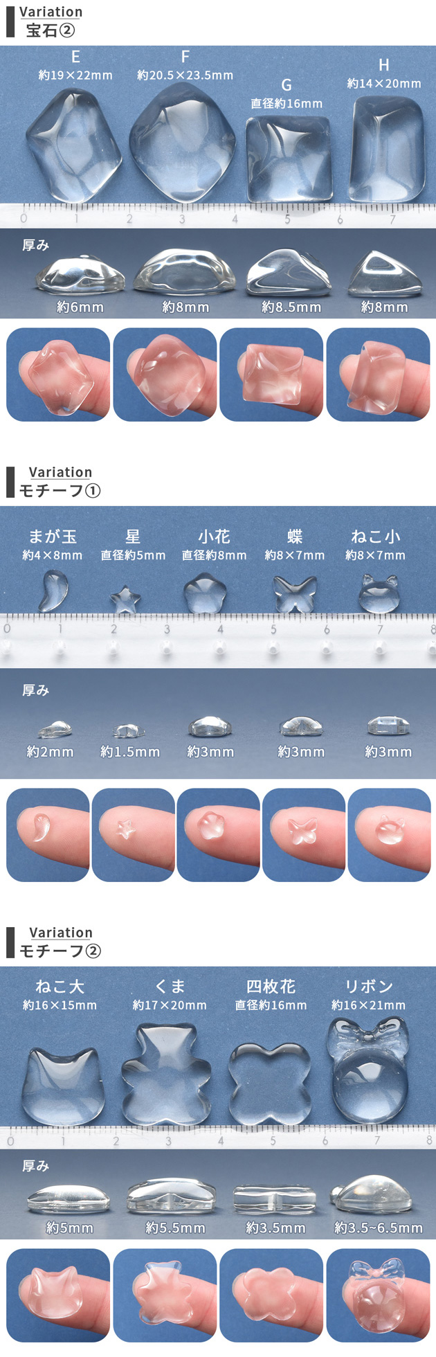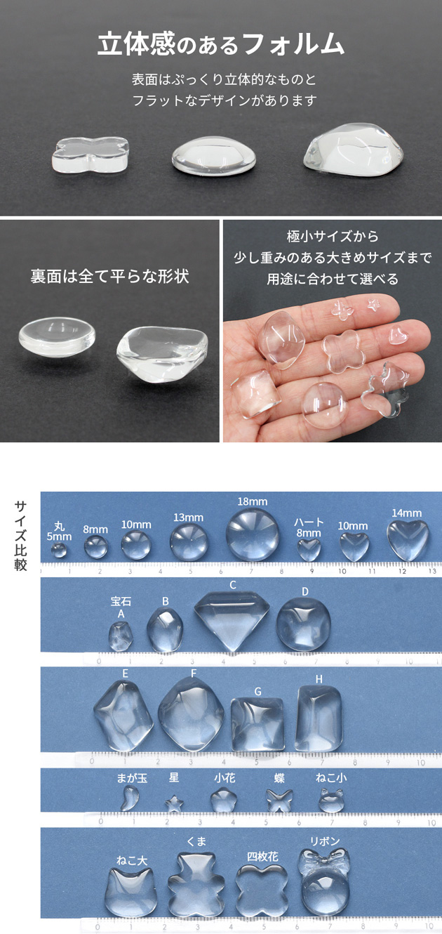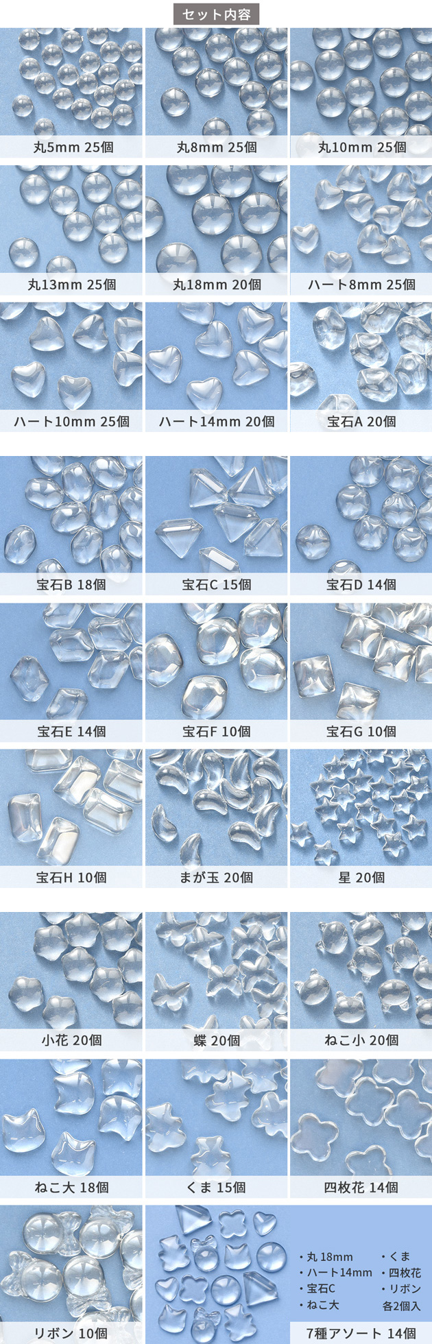 | ■商品番号・内容量 | ■丸 【4761-1】5mm/25個 【4761-2】8mm/25個 【4761-3】10mm/25個 【4761-5】13mm/25個 【4761-6】18mm/20個 ■ハート 【4761-7】8mm/25個 【4761-8】10mm/25個 【4761-9】14mm/20個 ■宝石 【4759-5】A/20個 【4762-1】B/18個 【4762-4】C/15個 【4762-5】D/14個 【4762-6】E/14個 【4762-9】F/10個 【4762-10】G/10個 【4762-11】H/10個 ■モチーフ 【4759-1】まが玉/20個 【4759-2】星/20個 【4759-3】小花/20個 【4759-4】蝶/20個 【4759-6】ねこ小/20個 【4762-2】ねこ大/18個 【4762-3】くま/18個 【4762-7】四枚花/14個 【4762-8】リボン/10個 【4762-99】7種アソート/14個 (内訳:丸18mm、ハート14mm、宝石C、ねこ大、くま、四枚花、リボン 各2個) |